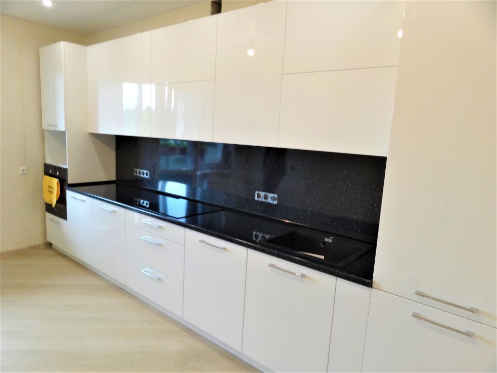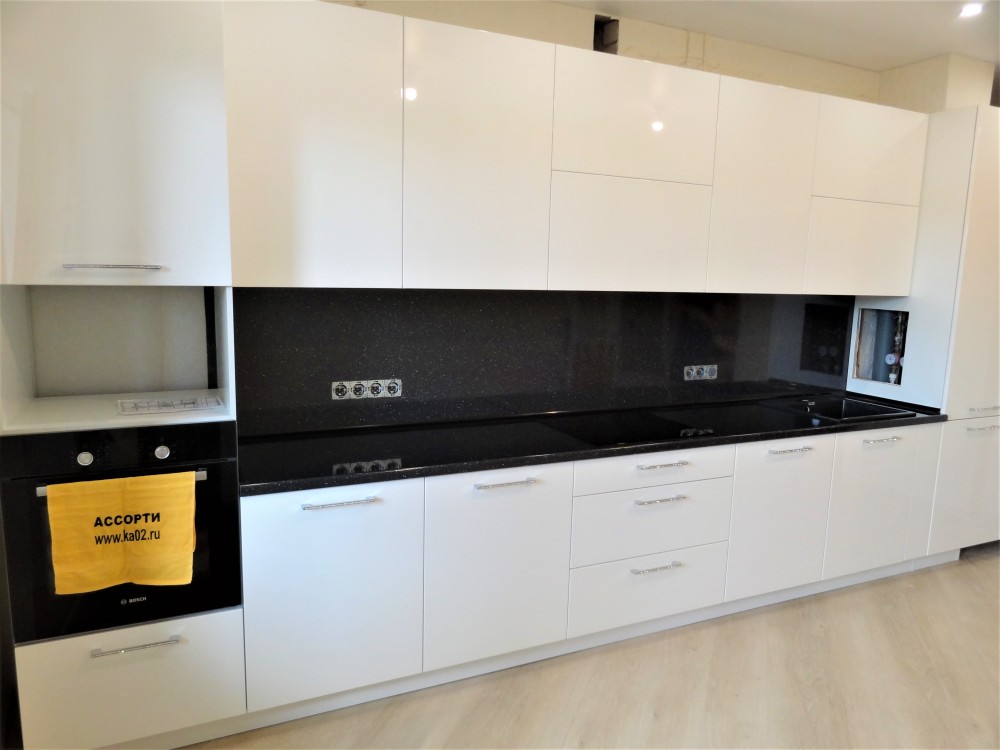 Кухонный гарнитур изготовлен под заказ и установлен в г. Уфа. Фасады кухни эмаль, столешница кухни влагостойкая 38мм Кедр, фартук кухни в цвет столешницы, фурнитура кухни австрийская Блюм с доводчиками, поддон гигиенический в корпусе мойки, коврики влагозащитные в ящиках, евро сушилка, лоток под столовые приборы, цоколь плинтус, ручки. Цена кухни с установкой от 20000 рублей за п.м. Срок изготовления кухни на заказ от 10 дней. Возможна рассрочка на 12 мес. без переплаты и без первого взноса, или в кредит на 3 года без первого взноса.